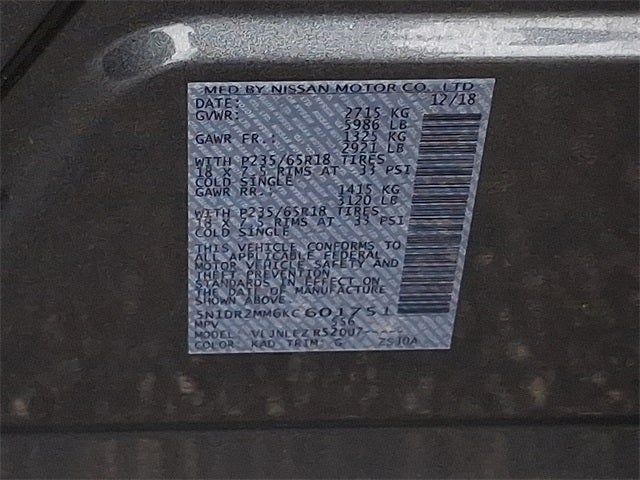 This Vehicle Includes the Following Options: 4WD, 3rd row seats: bench, 4-Wheel Disc Brakes, 5.25 Axle Ratio, 6 Speakers, 6-Speaker Audio System, ABS brakes, Air Conditioning, Alloy wheels, AM/FM radio: SiriusXM, Auto-dimming Rear-View mirror, Automatic temperature control, Blind Spot Warning, Brake assist, Bumpers: body-color, Carpeted Floor Mats (4-pc Set), CD player, Cloth Seating Surfaces, Compass, Delay-off headlights, Driver door bin, Driver vanity mirror, Dual front impact airbags, Dual front side impact airbags, Electronic Stability Control, Four wheel independent suspension, Front anti-roll bar, Front Bucket Seats, Front Center Armrest, Front dual zone A/C, Front fog lights, Front reading lights, Fully automatic headlights, Garage door transmitter: HomeLink, Illuminated entry, Leather Shift Knob, Leather steering wheel, Low tire pressure warning, NissanConnect w/Navigation & Services, Occupant sensing airbag, Outside temperature display, Overhead airbag, Overhead console, Panic alarm, Passenger door bin, Passenger vanity mirror, Power door mirrors, Power driver seat, Power steering, Power windows, Radio data system, Radio: AM/FM/CD Audio System w/NissanConnect, Rear air conditioning, Rear anti-roll bar, Rear Parking Sensors, Rear reading lights, Rear seat center armrest, Rear window defroster, Rear window wiper, Reclining 3rd row seat, Remote keyless entry, Roof rack: rails only, Security system, SiriusXM Traffic, Speed control, Speed-sensing steering, Speed-Sensitive Wipers, Split folding rear seat, Spoiler, Steering wheel mounted audio controls, Tachometer, Telescoping steering wheel, Tilt steering wheel, Traction control, Trip computer, Turn signal indicator mirrors, Variably intermittent wipers, and Wheels: 18 x 7.5 J Machined Aluminum-Alloy.