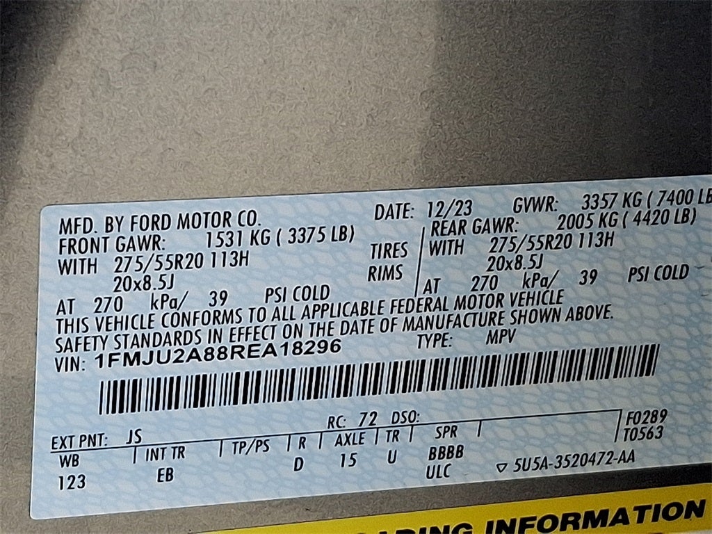 This Vehicle Includes the Following Options: Equipment Group 301A Mid Package (Panoramic Vista Roof), 4WD, 12 Speakers, 3.31 Axle Ratio, 3rd row seats: split-bench, 4-Wheel Disc Brakes, ABS brakes, Adjustable pedals, Air Conditioning, Alloy wheels, AM/FM radio: SiriusXM with 360L, Auto High-beam Headlights, Auto-dimming door mirrors, Auto-dimming Rear-View mirror, Automatic temperature control, Brake assist, Bumpers: body-color, Compass, Delay-off headlights, Driver door bin, Driver vanity mirror, Dual front impact airbags, Dual front side impact airbags, Electronic Stability Control, Emergency communication system: SYNC 4 911 Assist, Exterior Parking Camera Rear, Four wheel independent suspension, Front anti-roll bar, Front Bucket Seats, Front Center Armrest, Front dual zone A/C, Front fog lights, Front License Plate Bracket, Front reading lights, Fully automatic headlights, Garage door transmitter, Heated & Ventilated Leather Front Captain's Chairs, Heated door mirrors, Heated front seats, Heated rear seats, Heated steering wheel, Illuminated entry, Leather steering wheel, Low tire pressure warning, Memory seat, Navigation system: Connected Navigation, Occupant sensing airbag, Outside temperature display, Overhead airbag, Overhead console, Panic alarm, Passenger door bin, Passenger vanity mirror, Pedal memory, Power door mirrors, Power driver seat, Power Liftgate, Power moonroof, Power passenger seat, Power steering, Power windows, Radio data system, Radio: B&O Sound System by Bang & Olufsen, Rain sensing wipers, Rear air conditioning, Rear anti-roll bar, Rear reading lights, Rear window defroster, Rear window wiper, Reclining 3rd row seat, Remote keyless entry, Security system, SiriusXM w/360L, Speed control, Speed-sensing steering, Speed-Sensitive Wipers, Split folding rear seat, Spoiler, Steering wheel memory, Steering wheel mou