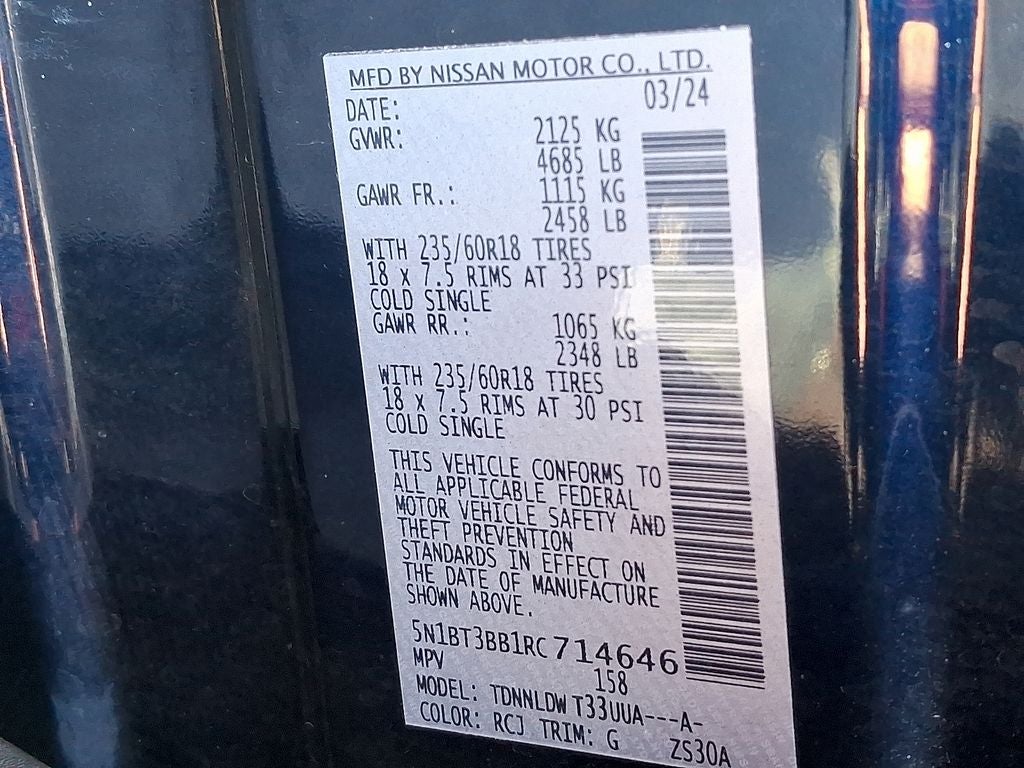 THIS VEHICLE INCLUDES THE FOLLOWING FEATURES AND OPTIONS: AWD, 4-Wheel Disc Brakes, 5.676 Axle Ratio, 6 Speakers, ABS brakes, Air Conditioning, Alloy wheels, AM/FM radio: SiriusXM, Auto High-beam Headlights, Automatic temperature control, Brake assist, Bumpers: body-color, Cloth Seat Trim w/Patterned Inserts, Delay-off headlights, Driver door bin, Driver vanity mirror, Dual front impact airbags, Dual front side impact airbags, Electronic Stability Control, Emergency communication system: NissanConnect Services, First Aid Kit, Floor Mats w/1-Piece Cargo Area Protector, Four wheel independent suspension, Front anti-roll bar, Front Bucket Seats, Front Center Armrest, Front dual zone A/C, Front reading lights, Fully automatic headlights, Heated door mirrors, Illuminated entry, Knee airbag, Low tire pressure warning, NissanConnect featuring Apple CarPlay and Android Auto, Occupant sensing airbag, Outside temperature display, Overhead airbag, Overhead console, Panic alarm, Passenger door bin, Passenger vanity mirror, Power door mirrors, Power driver seat, Power Liftgate, Power steering, Power windows, Radio data system, Radio: AM/FM NissanConnect, Rear anti-roll bar, Rear Parking Sensors, Rear seat center armrest, Rear side impact airbag, Rear window defroster, Rear window wiper, Remote keyless entry, Speed control, Speed-Sensitive Wipers, Split folding rear seat, Spoiler, Steering wheel mounted audio controls, Tachometer, Telescoping steering wheel, Tilt steering wheel, Traction control, Trip computer, Variably intermittent wipers, and Wheels: 18 Dark Painted Machine Finished Alloy. 28/35 City/Highway MPG